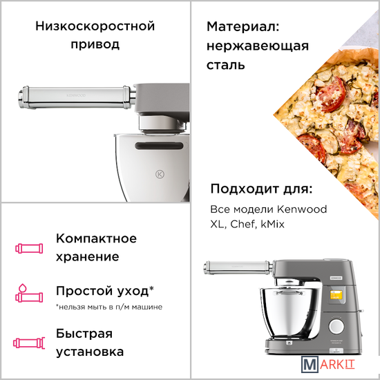 Насадка для кухонного комбайна Kenwood KAX99.A0ME станет незаменимым помощником в раскатывании теста для пасты. ИТАЛЬЯНСКИЕ БЛЮДА НА ДОМАШНЕЙ КУХНЕ Настоящую пасту можно готовить дома с помощью насадки для кухонного комбайна Kenwood KAX99.A0ME. Тесто после раскатки на насадке от Kenwood получается ровным, гладким и идеальной толщины для дальнейшего приготовления пасты. Получите более широкие листы с насадкой 22см. Благодаря 10 настраиваемым режимам Вы можете получить тесто необходимой ширины для приготовления лазаньи, равиоли и тортеллини. Широкая насадка идеально подходит для приготовления лепешек и питты. Насадка удобна в использовании. Ее можно с легостью очистить после использования, к ней не прилипает тесто, не деформируется и не поддается коррозии, а так же в комплекте идет щеточка, которая сделает уход за насадкой еще более простым. Важно, насадку нелья мыть, только протирать влажной салфеткой.