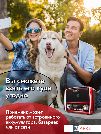 Портативный радиоприёмник с фонариком - радио колонка MP3 c работой от сети аккумулятора и батареек. Радиоприемник MIRU SR-1025 выполнен в красно-чёрном корпусе с ретро дизайном и представляет собой простое устройство для воспроизведения потокового радио вещания. Модель предусматривает всего один динамик, но этого вполне достаточно, чтобы вы получили насыщенный звук. Радиоприемник улавливает радио каналы в диапазоне FM, АМ и SW, гарантируя отличную связь благодаря встроенной телескопической антенне, которая способствует улучшению сигнала. MIRU SR-1025 имеет линейный аудио вход и поддержку чтения microSD карт. Благодаря тому что, радиоприёмник работает не только от сети 220 В, но и от аккумулятора или батареек, он является мобильным устройством. Вы сможете взять его на пикник и наслаждаться трансляцией любимой радио передачи в компании с веселыми ведущими. Для управления устройства предусмотрены механические переключатели.
